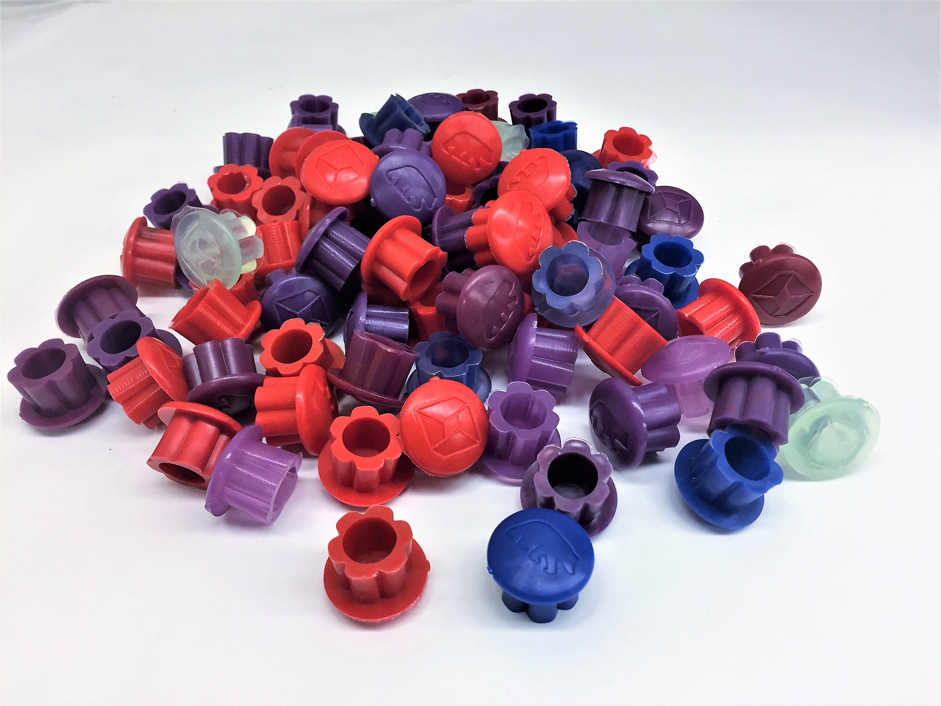 The plugs were molded on a vertical Arburg injection molder, in molds I designed and CNC-machined. I used an unconventional insert-based injection mold and flexible plastic to create undercut geometry.